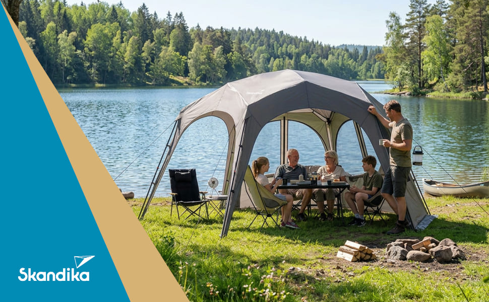 Der Skandika Pavillon Lundholm 462 Quick-Start überzeugt durch seine innovative Konstruktion, die den Aufbau zum Kinderspiel macht. Dank des vormontierten Gestänges mit Quick-Start Funktion lässt sich der Pavillon in kürzester Zeit aufstellen: Mit einem einzigen Zug das Dach aufspannen, die teleskopischen Stangen ausfahren und einrasten, alles abstecken – fertig! Diese durchdachte Mechanik spart wertvolle Zeit und macht den Lundholm zum idealen Begleiter für spontane Gartenpartys, Campingausflüge oder entspannte Picknicks im Freien.