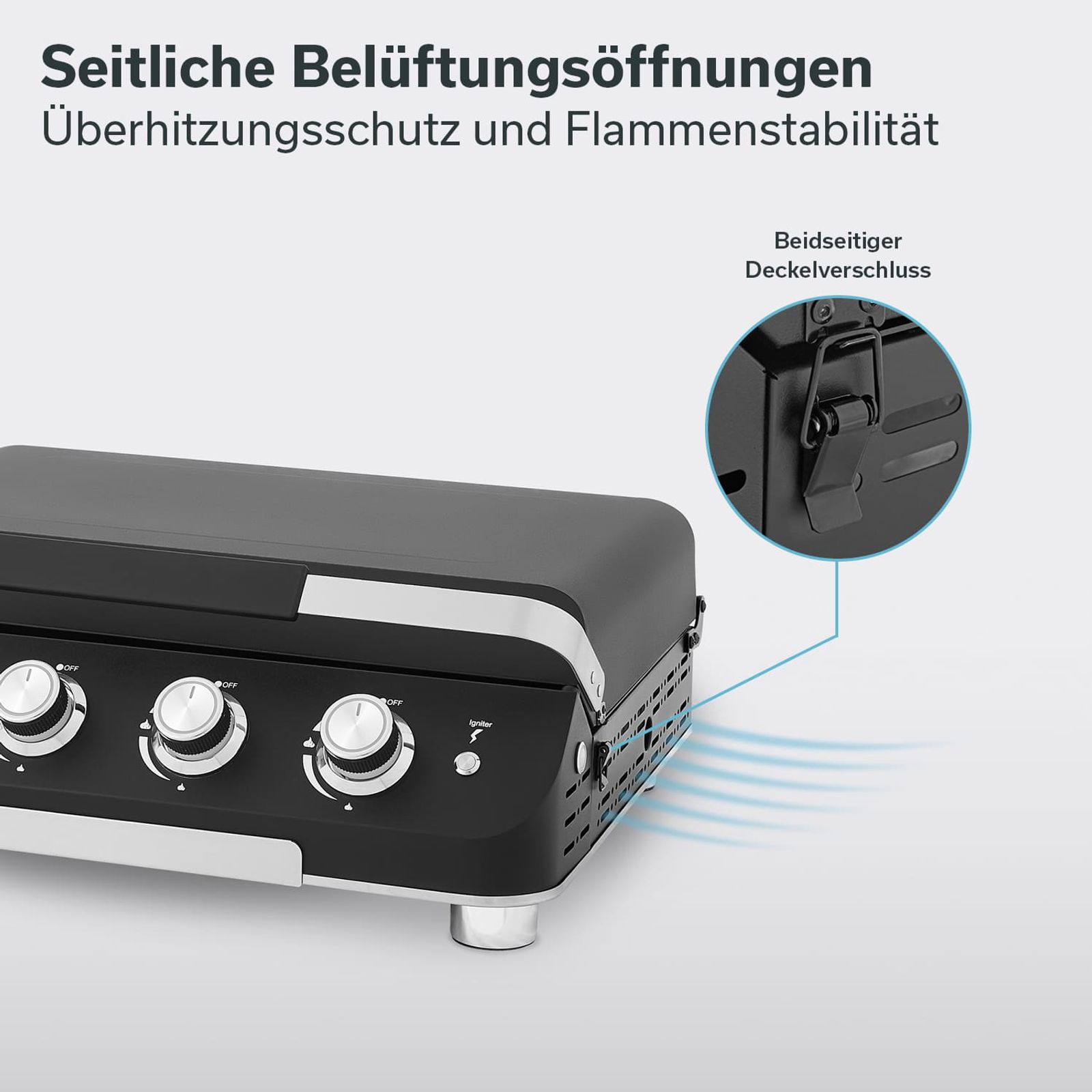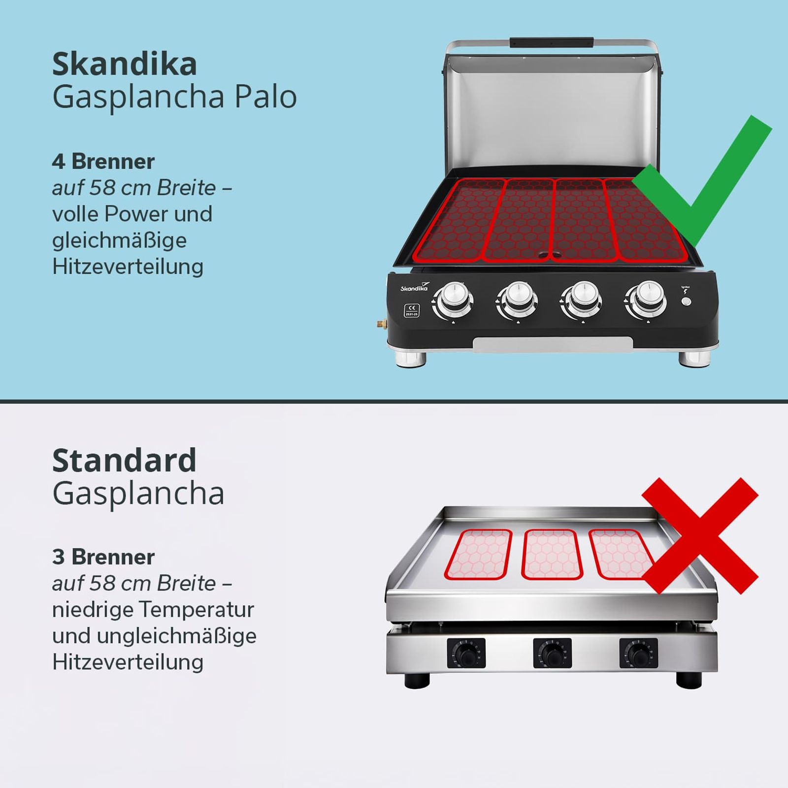 - Separat gesteuerte Brenner ermöglichen unterschiedliche Hitzezonen auf der Plancha-Platte