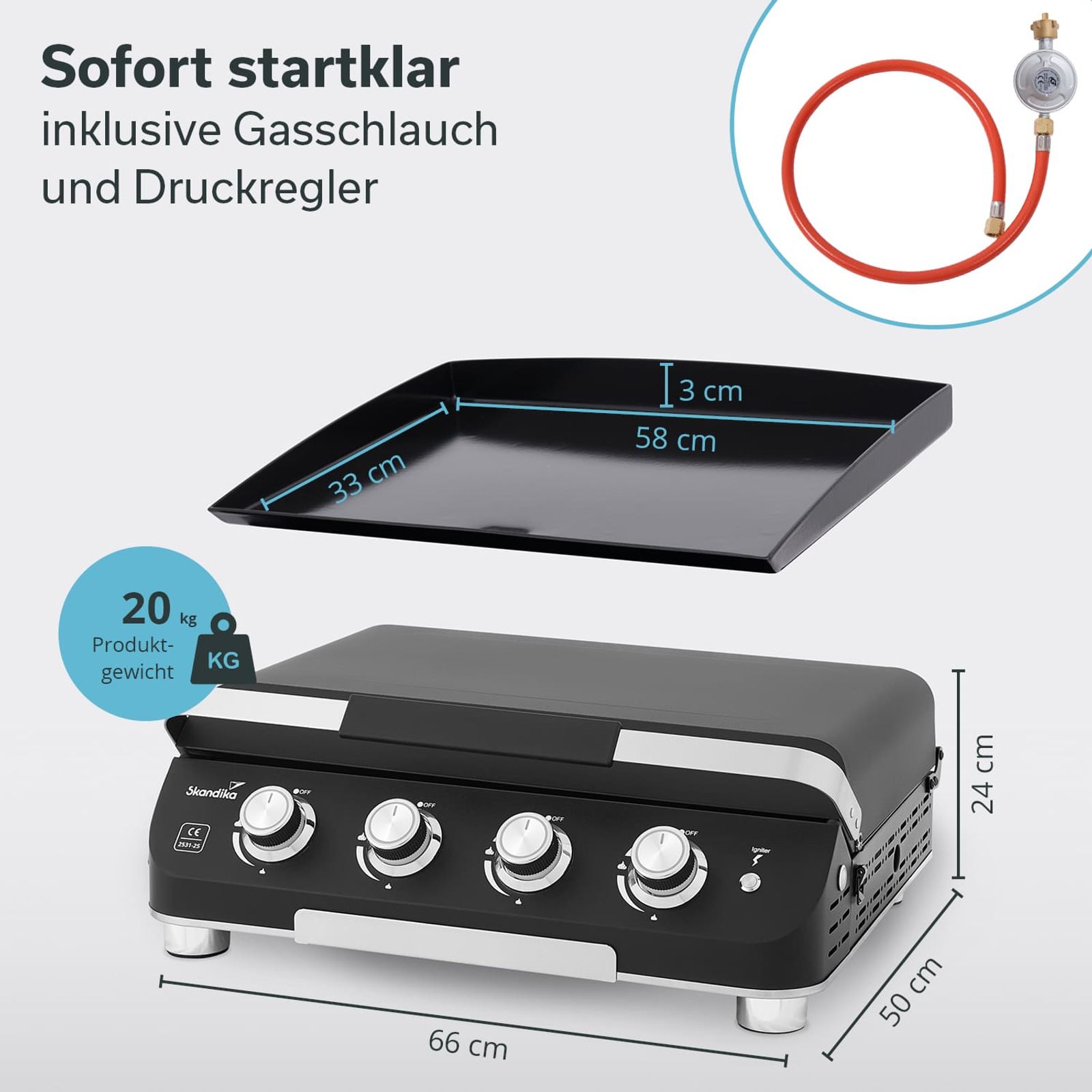 - Gesamtmaße 66 × 50 × 24 cm / Maße Plancha-Platte 58 × 33 × 3 cm / Gewicht 20 kg