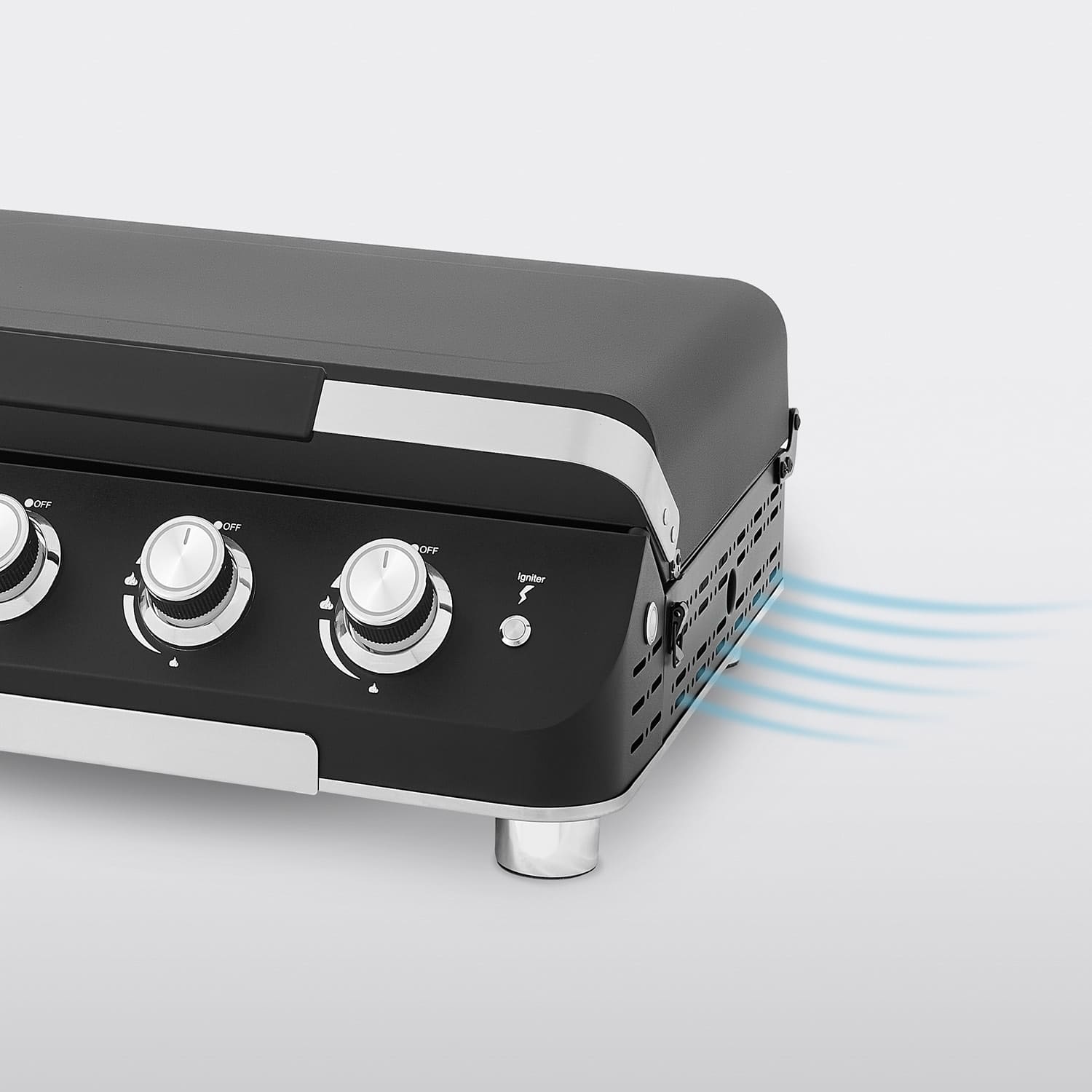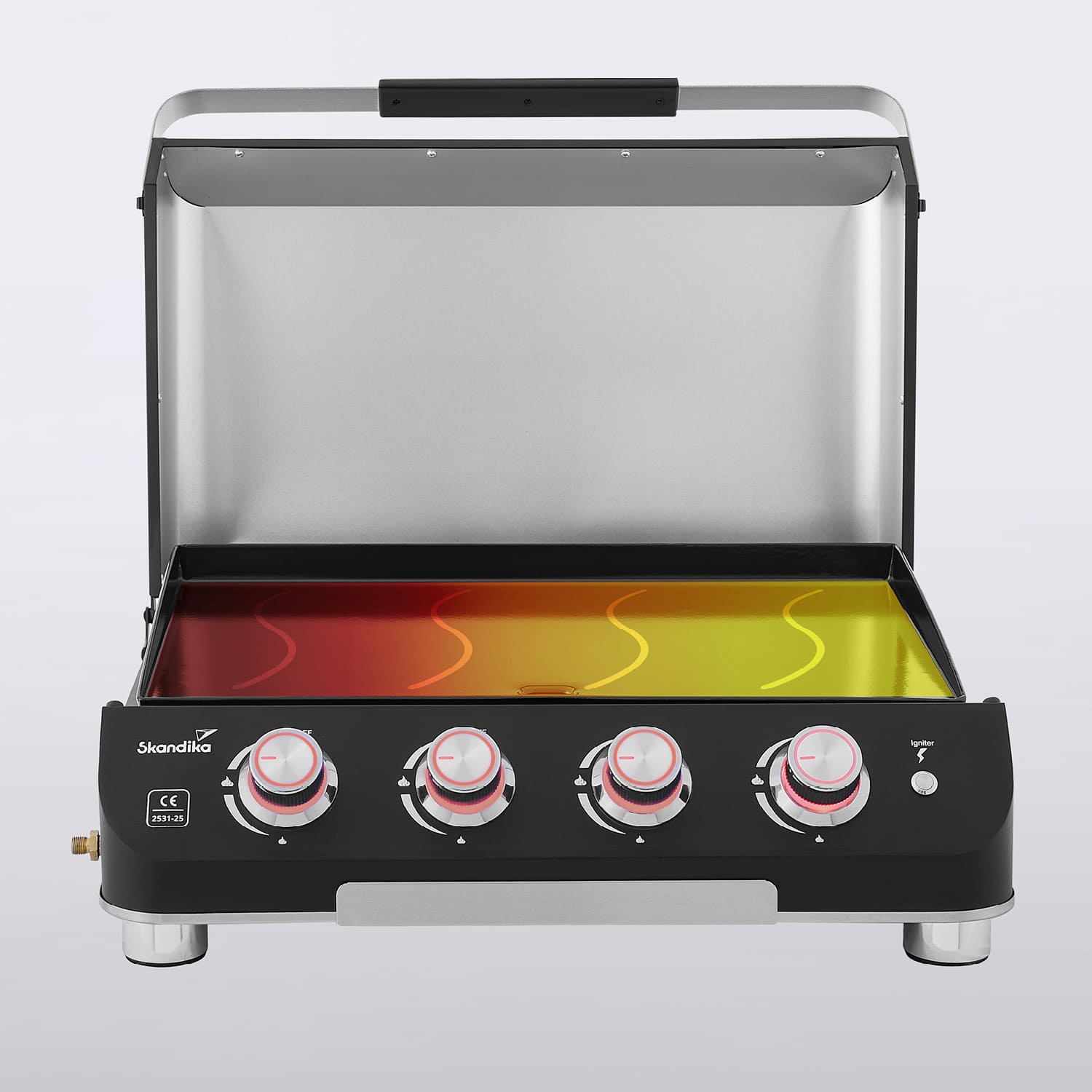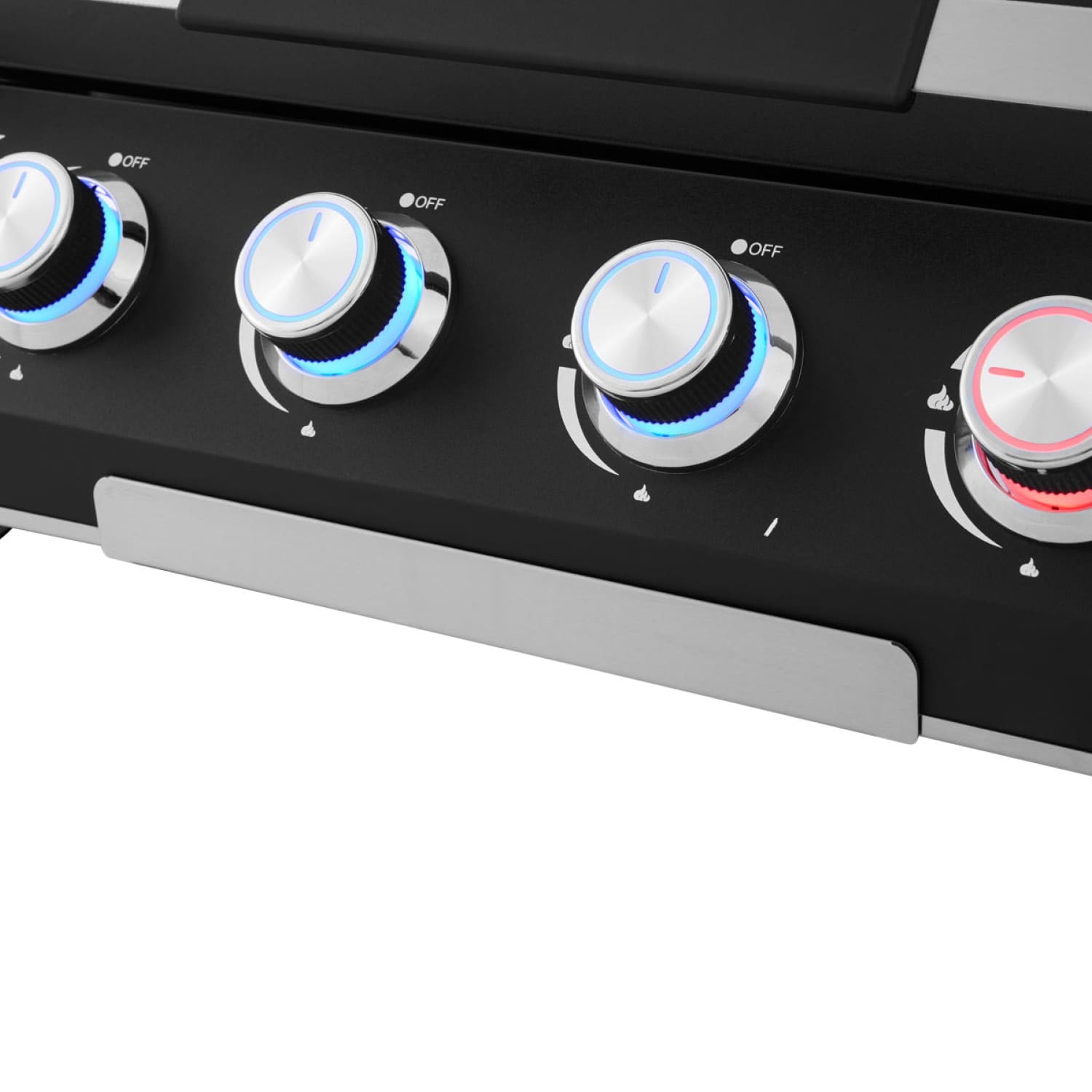 Die vier Brenner werden einzeln angezündet und ausgeschaltet und individuell über einen eigenen Drehregler gesteuert. In die Drehknöpfen integrierte rote bzw. blaue LEDs zeigen, ob die jeweiligen Brenner ein- oder ausgeschaltet sind. Die Elektrozündung wird per Knopfdruck betätigt – schnell, sicher und bedienerfreundlich.