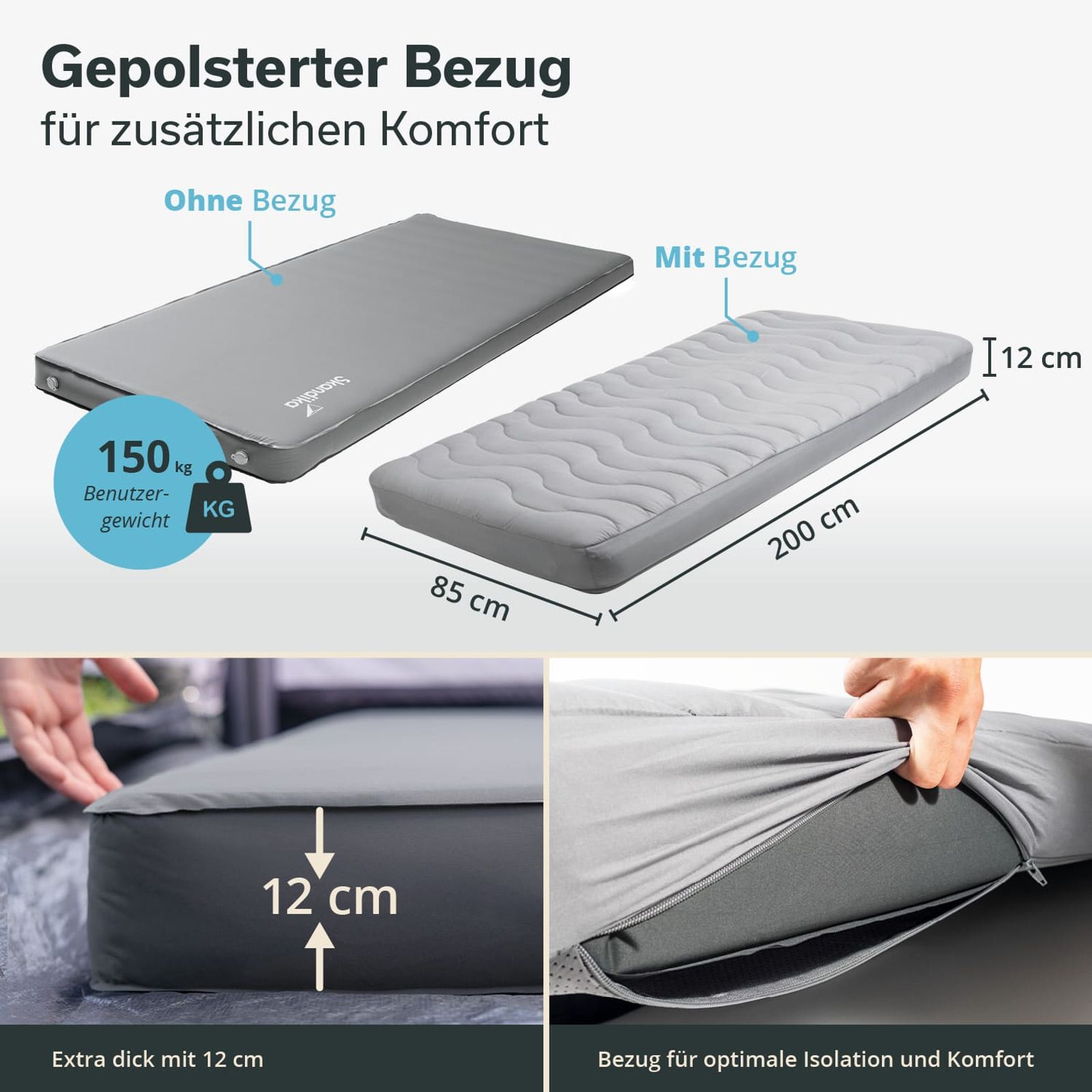 Selbstaufblasende Isomatte mit großer Liegefläche, 12 cm Höhe und Bezug