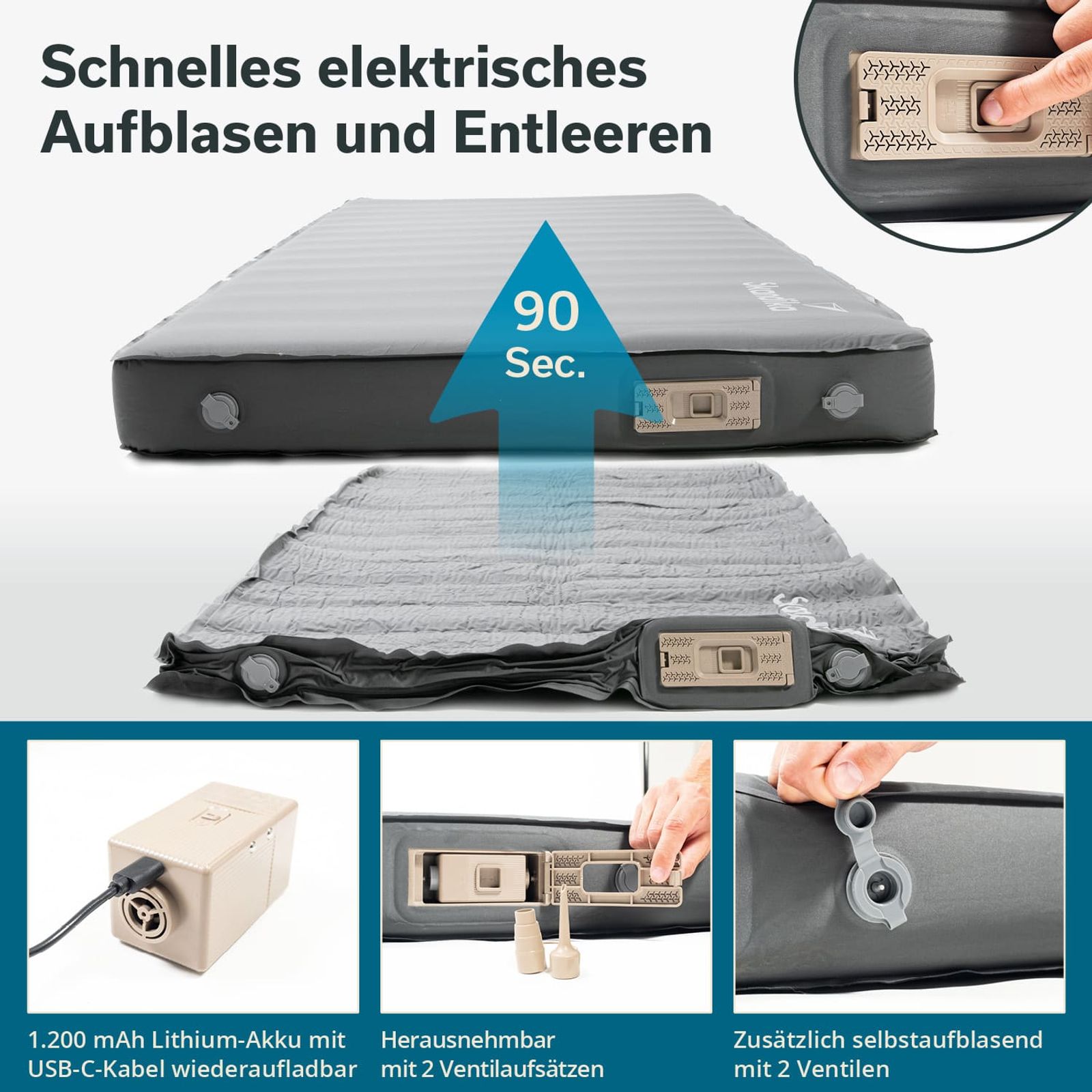 - Matte mit integrierter, wiederaufladbarer Pumpe für effizientes Aufblasen und Entleeren