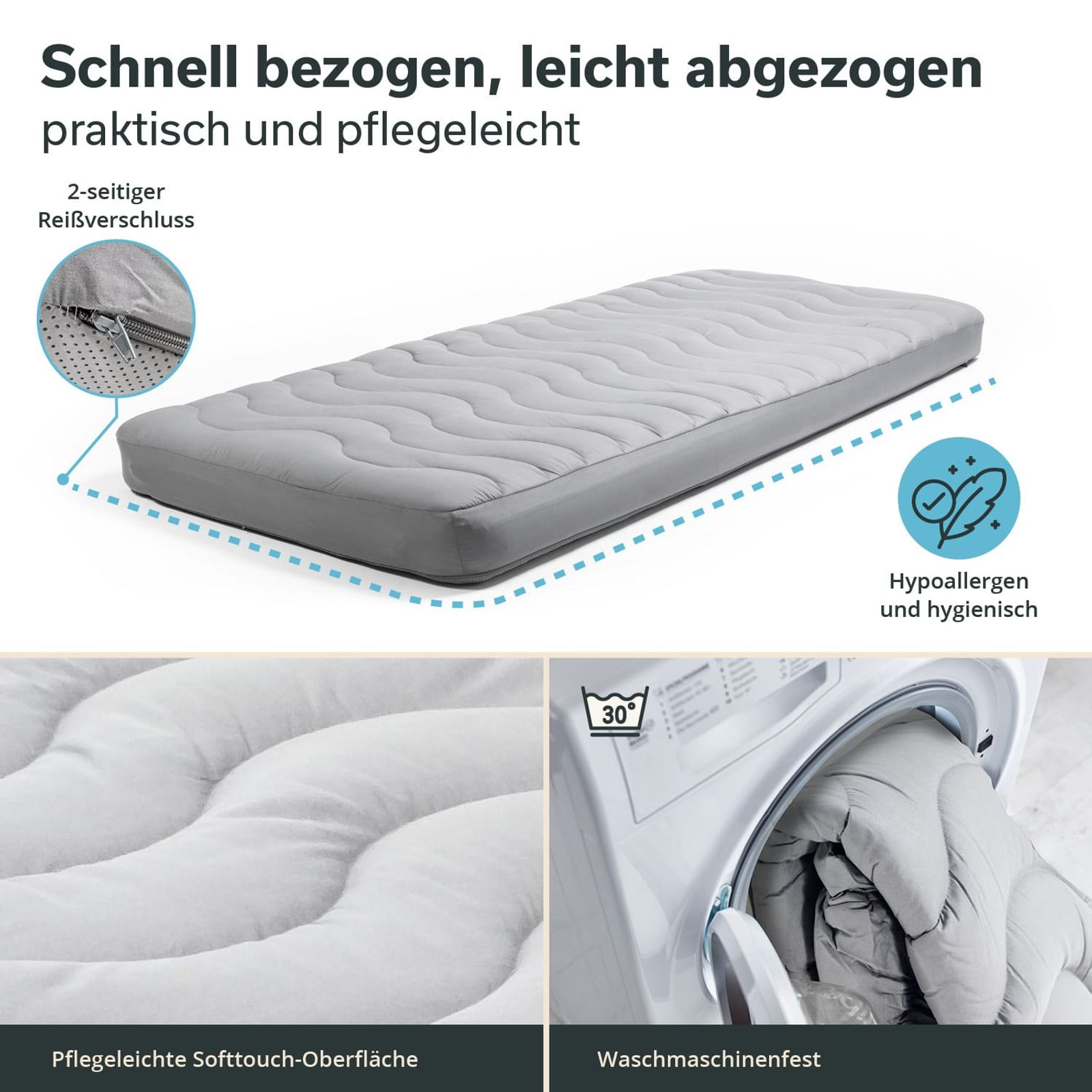 Die weich gepolsterte Oberseite mit flauschiger Polyesterfaser-Füllung erinnert an einen hochwertigen Topper und sorgt für eine besonders gemütliche Liegefläche.