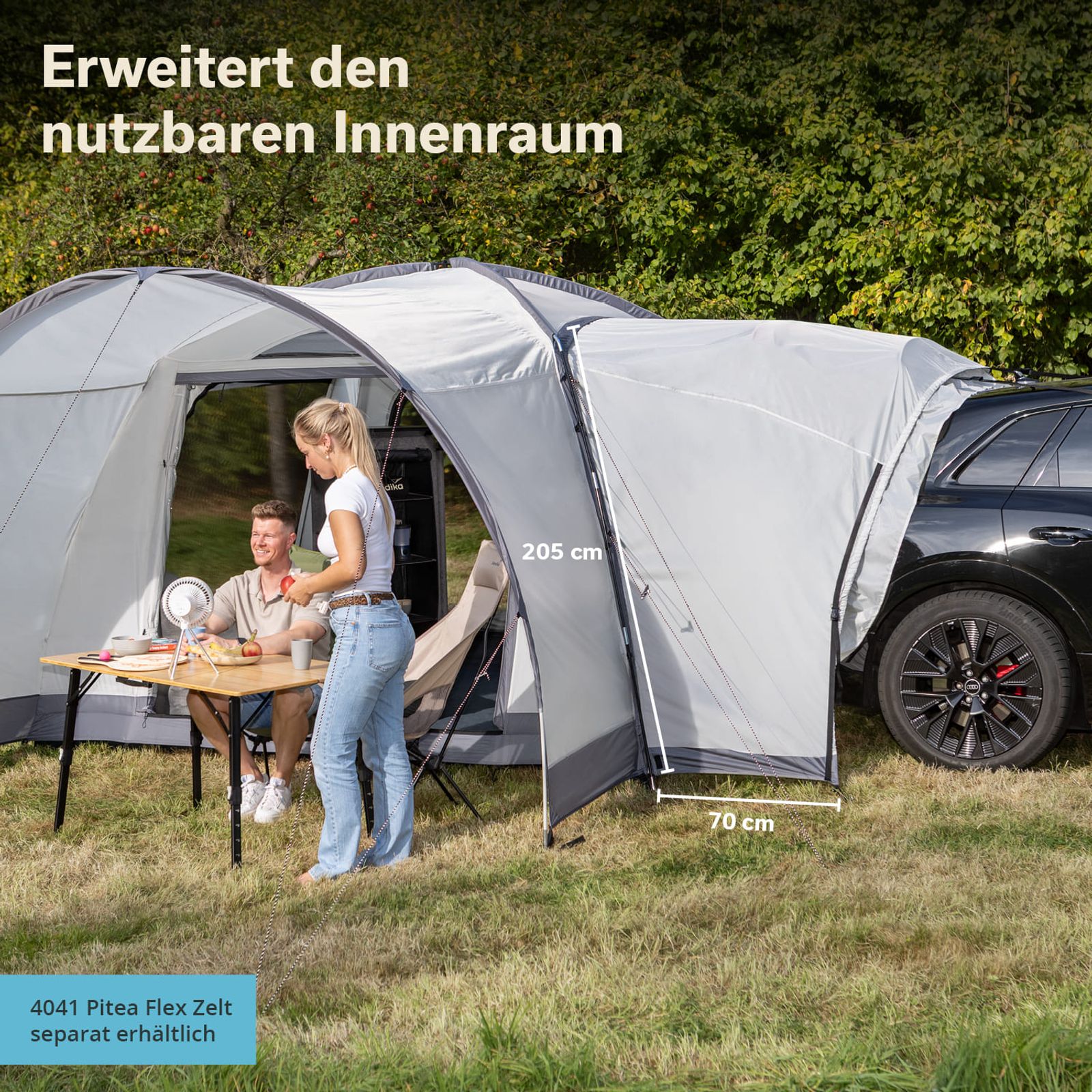 Diese praktische Fahrzeugschleuse für die Heckklappe eines SUVs ist Teil unseres modularen Pitea Flex Baukastensystems, das maximale Flexibilität bietet und sich dank Erweiterungen individuell an jede Campingsituation anpassen lässt.