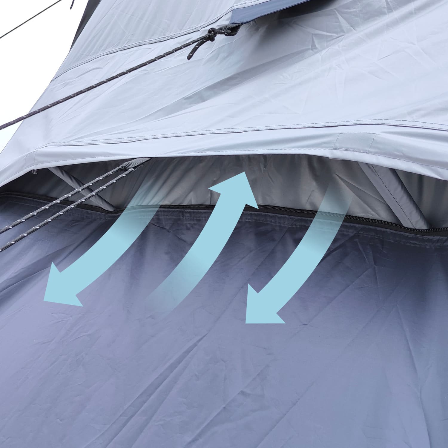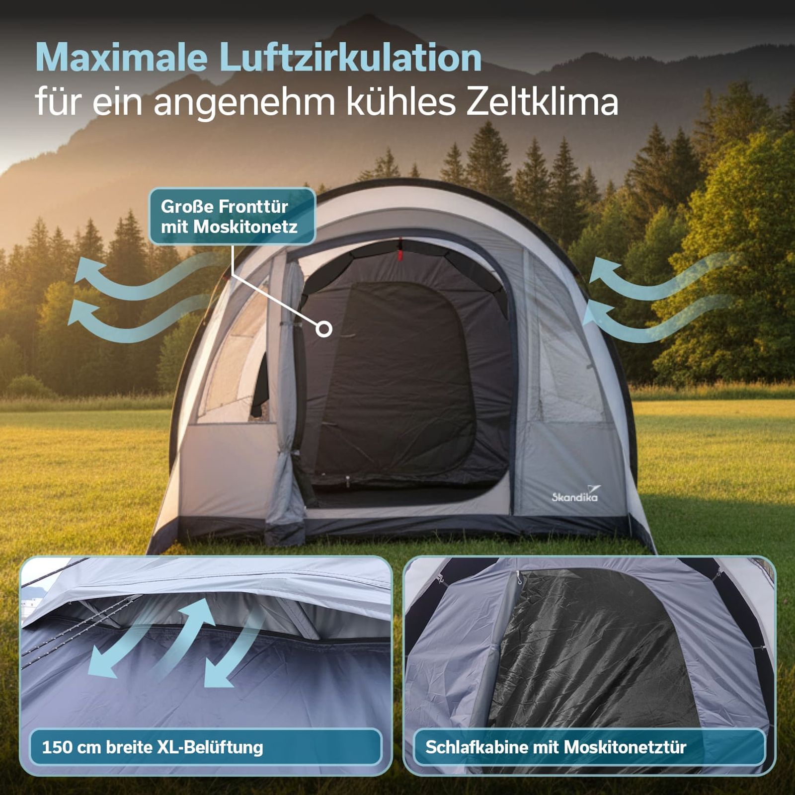 Die wettergeschützte Ventilationsöffnung in der Zeltrückwand sowie die Netzgewebeeinsätze in der Rückwand der Schlafkabine gewährleisten kontinuierlichen Luftaustausch für ein angenehmes Innenraumklima. Selbst an warmen Sommertagen bleibt das Zelt kühl und gut durchlüftet.