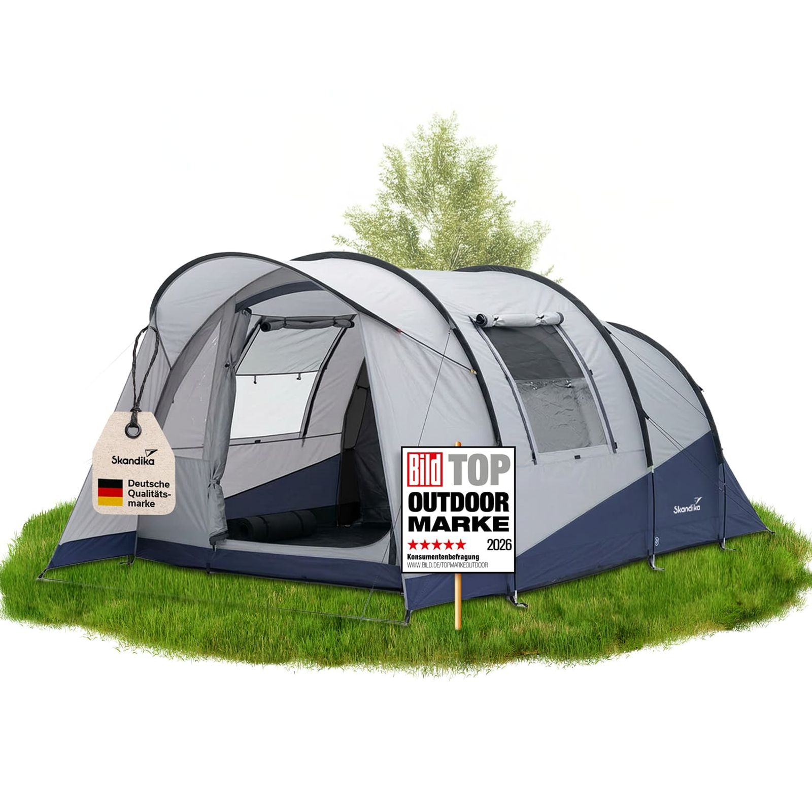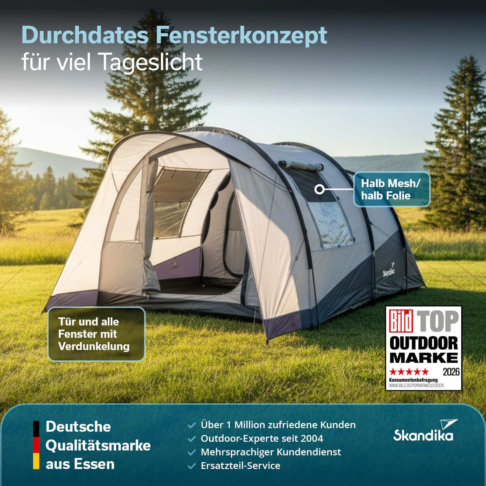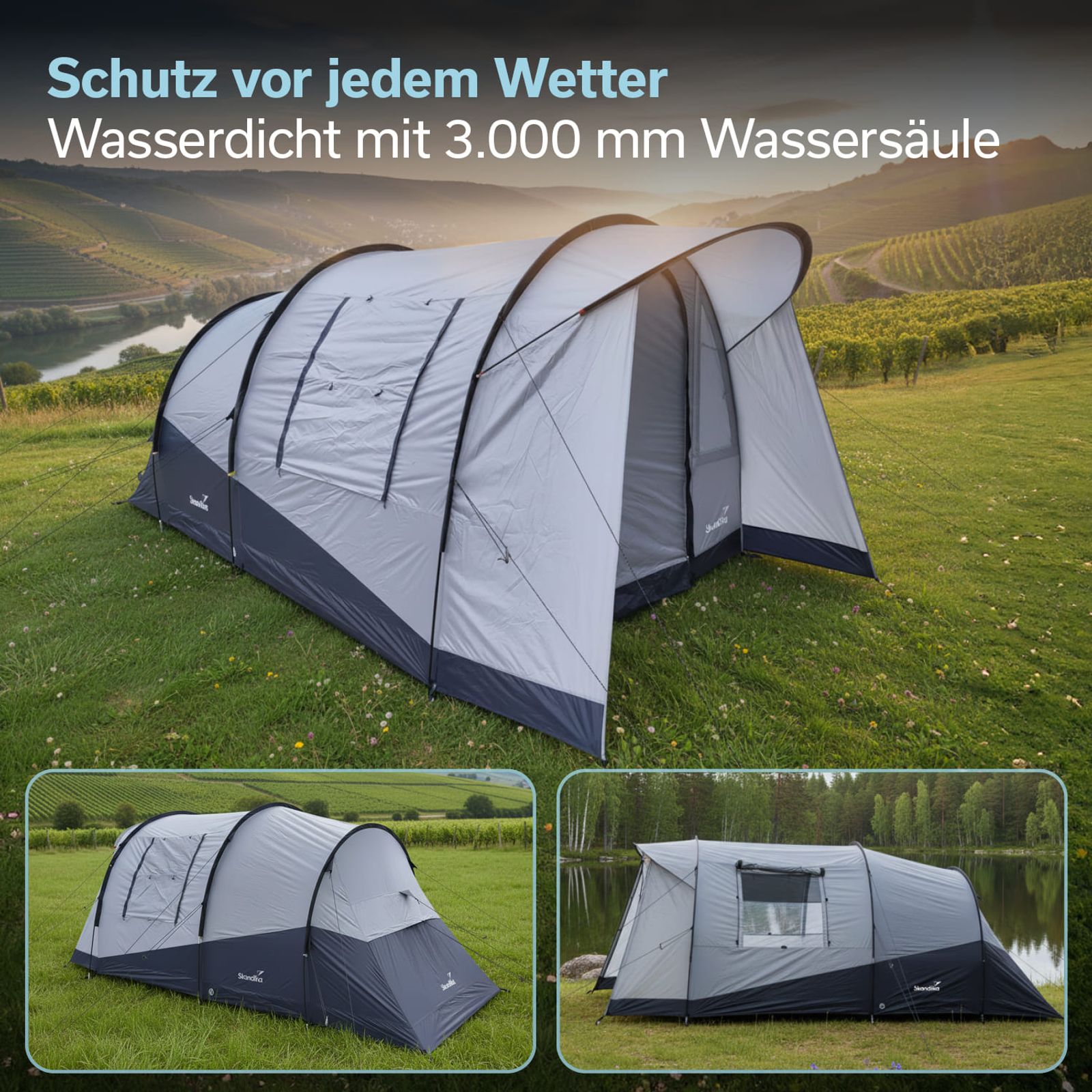 - Tunnelzelt für 3 Personen mit 190 cm Stehhöhe und großzügigem Wohnraum
