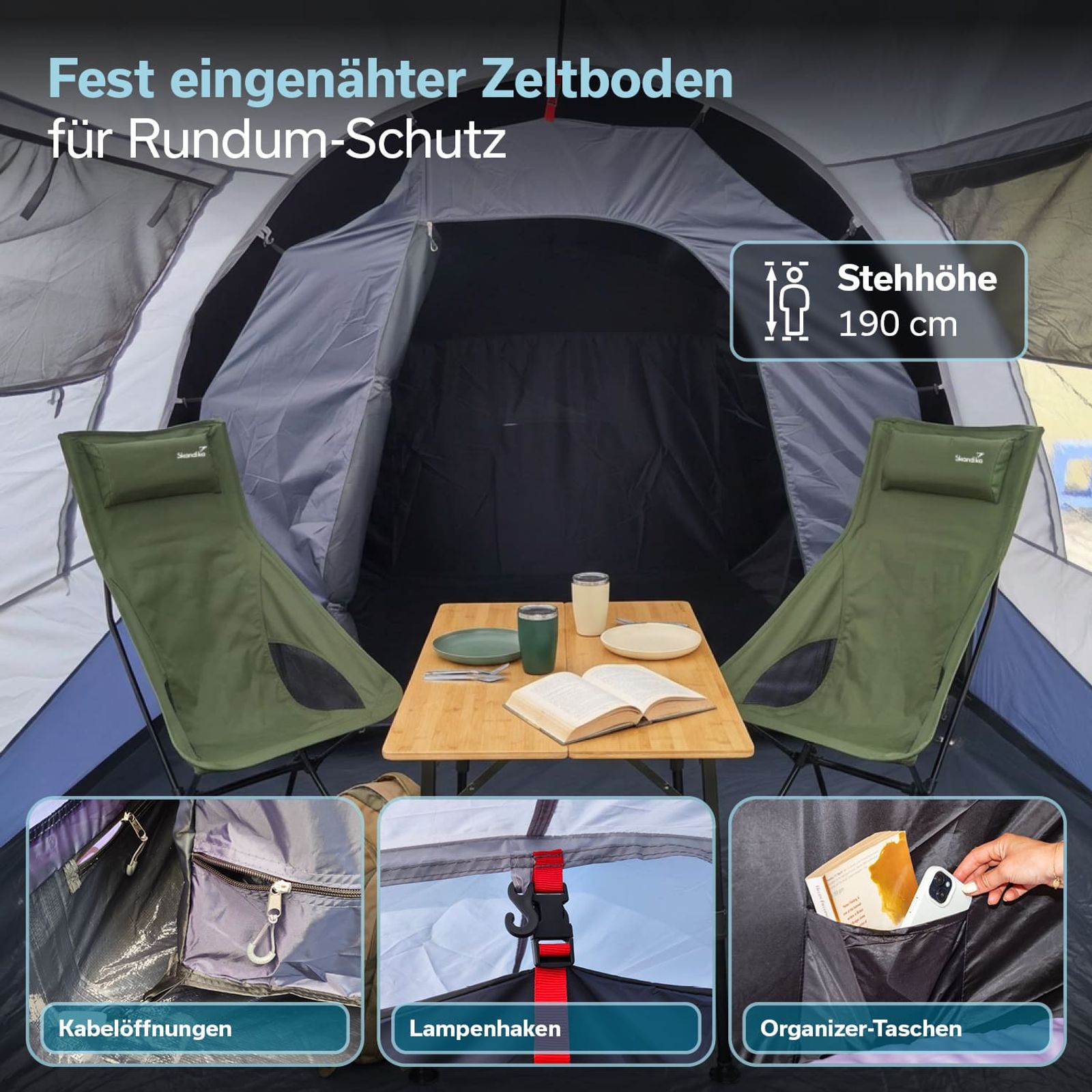 Praktische Organizer-Taschen in der Kabine halten Kleinigkeiten wie Smartphone oder Taschenlampe griffbereit. Deckenhaken im Wohnbereich und in der Kabine ermöglichen eine flexible Beleuchtung und je zwei Kabeldurchführungen im Außenzelt und in der Kabine erleichtern den Anschluss elektronischer Geräte.