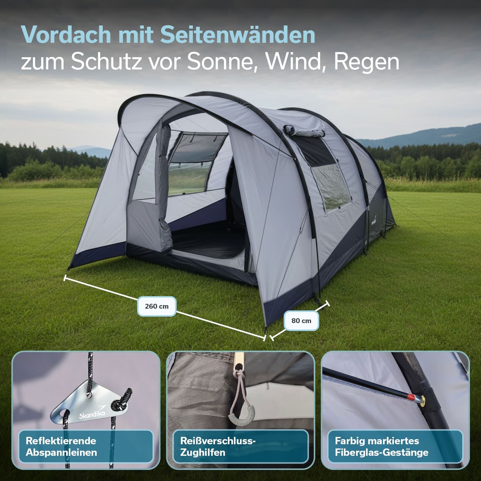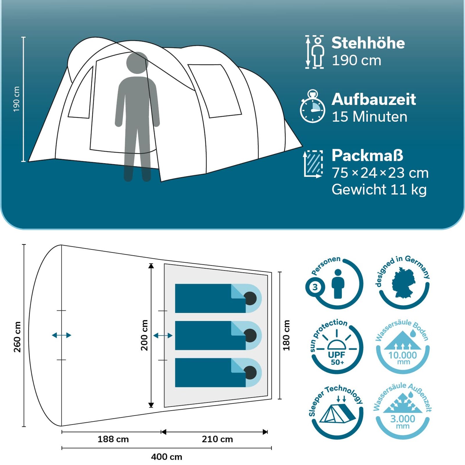 - Außenzelt 400 × 260 cm / Kabine 210 × 180 cm / Packmaß 75 × 24 × 23 cm / Gewicht 11 kg