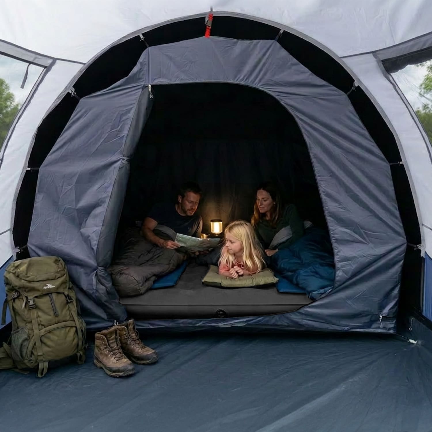 3-Personen-Zelt mit dunkler Schlafkabine und eingenähtem Zeltboden
