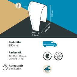 Die Schleuse ermöglicht einen wettergeschützten Übergang zwischen Zelt und geöffneter Schiebetür – passend für die meisten handelsüblichen Kastenwagen- und Minivan-Modelle.