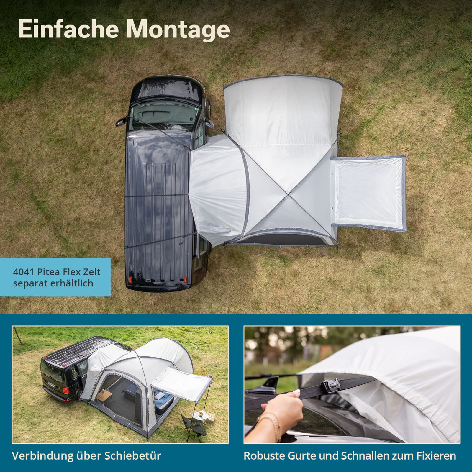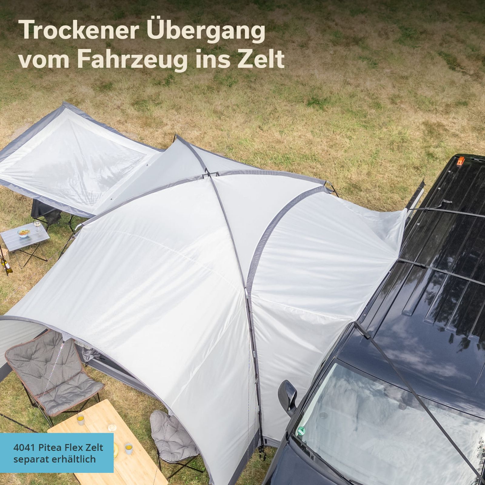 Diese praktische Fahrzeugschleuse für die seitliche Schiebetür eines Kastenwagens oder Minivans ist Teil unseres modularen Pitea Flex Baukastensystems, das maximale Flexibilität bietet und sich dank Erweiterungen individuell an jede Campingsituation anpassen lässt.