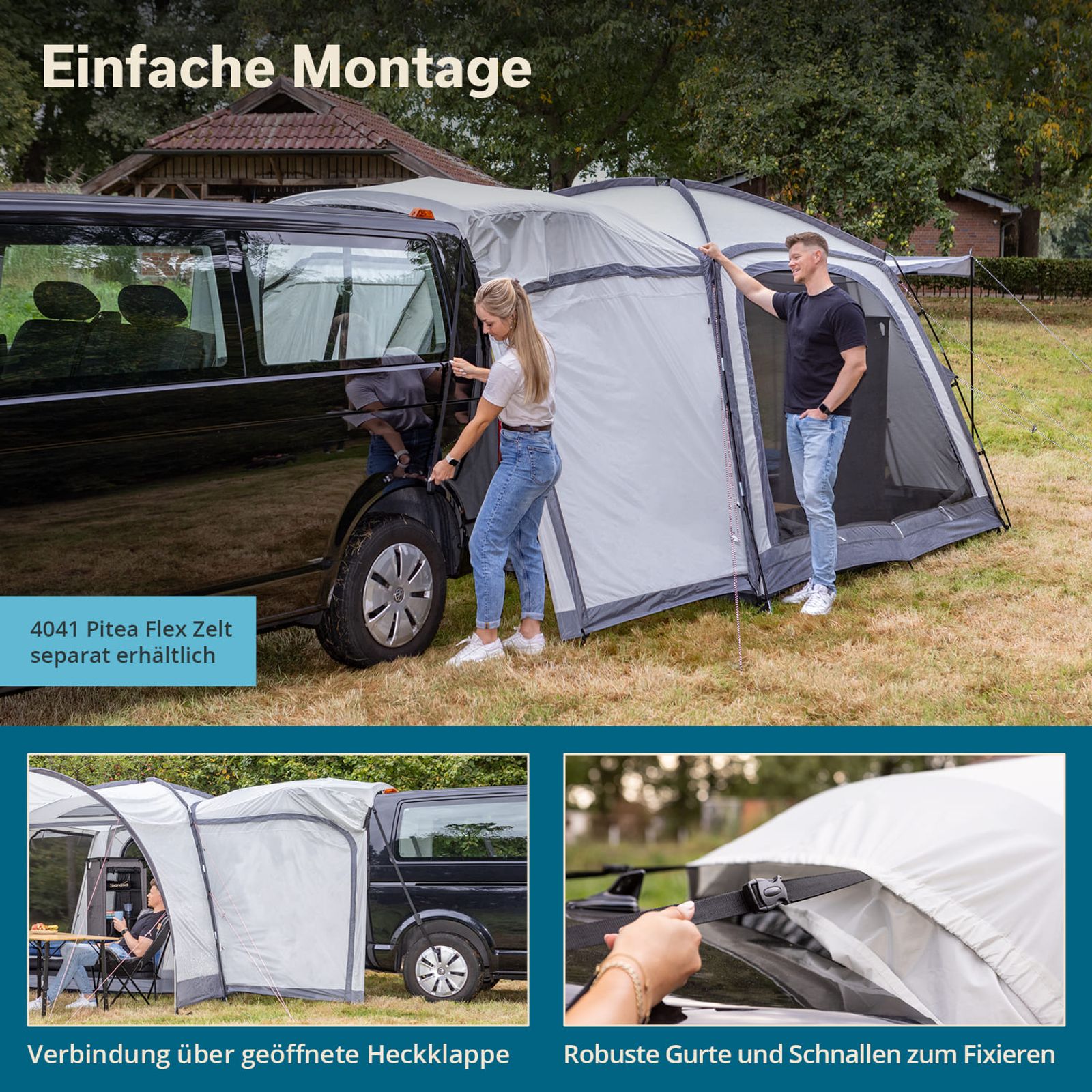 Diese praktische XXL-Fahrzeugschleuse für die Heckklappe eines Kastenwagens oder Minivans ist Teil unseres modularen Pitea Flex Baukastensystems, das maximale Flexibilität bietet und sich dank Erweiterungen individuell an jede Campingsituation anpassen lässt.