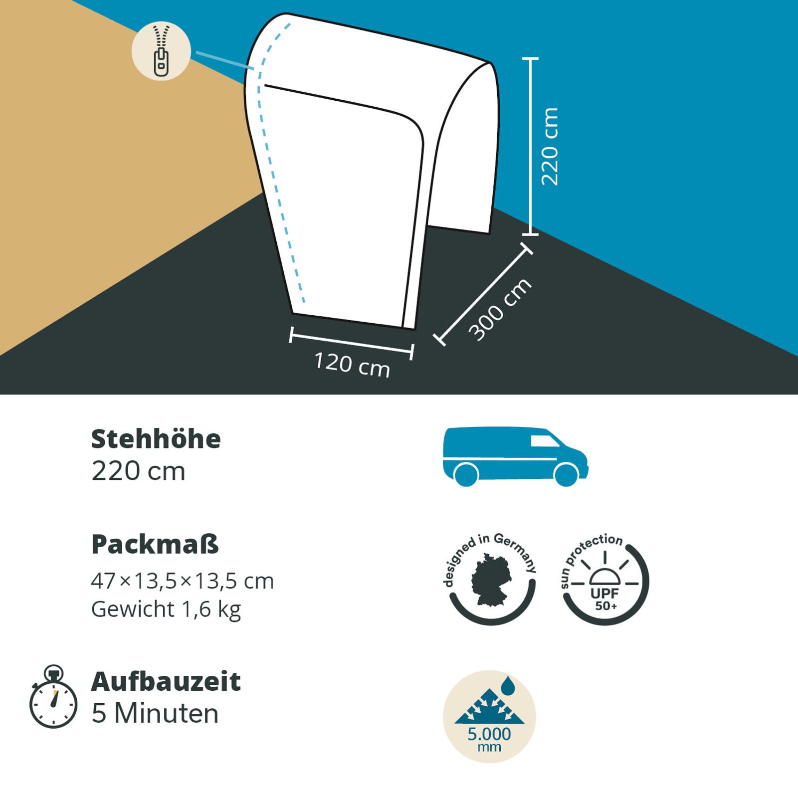 Die Schleuse ermöglicht einen wettergeschützten Übergang zwischen Zelt und geöffneter Heckklappe – passend für die meisten Kastenwagen- und Minivan-Modelle.