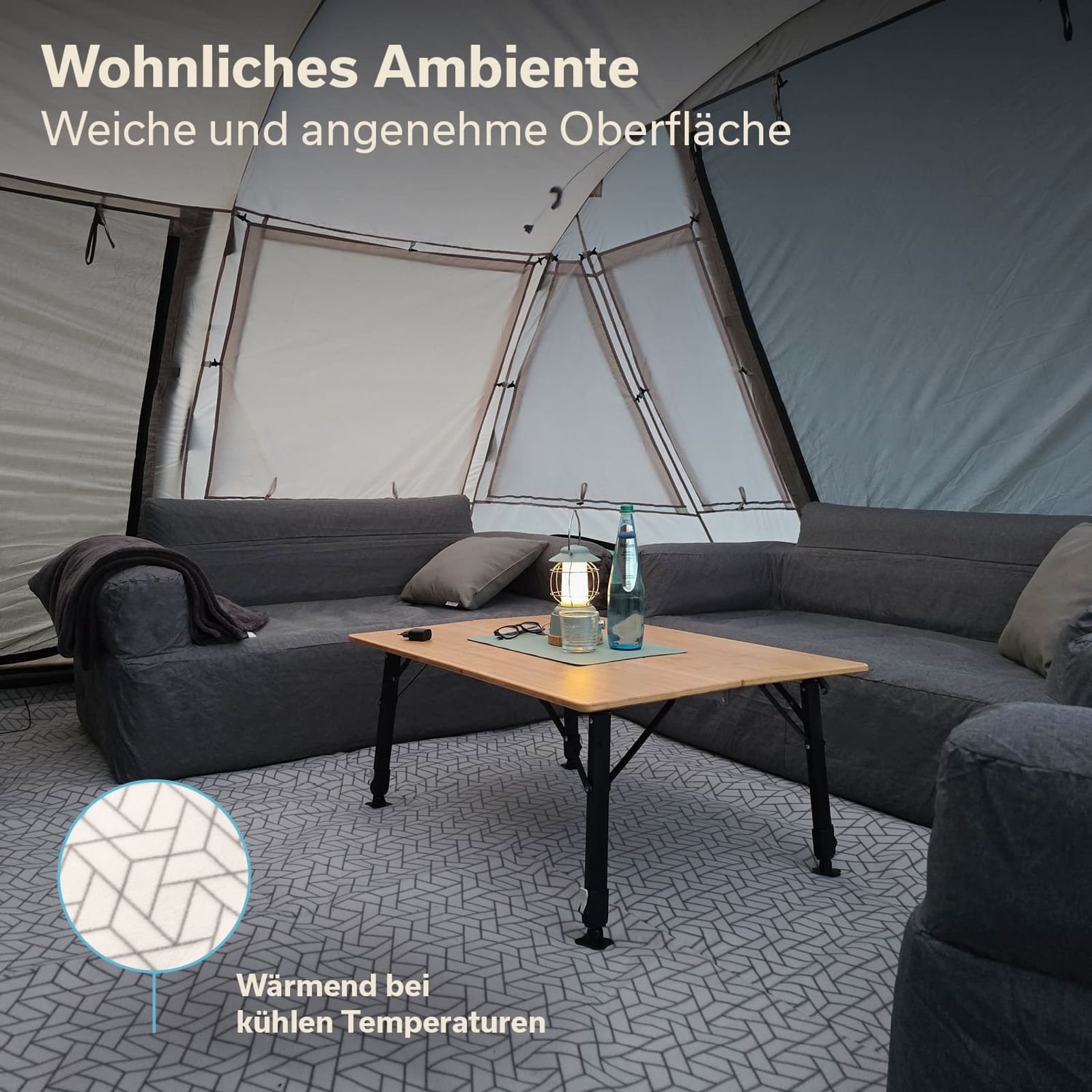Die Softtouch-Fleece-Oberfläche mit schickem, unaufdringlichem, geometrischem Muster sorgt für Wärme, Gemütlichkeit und Komfort im Zelt.